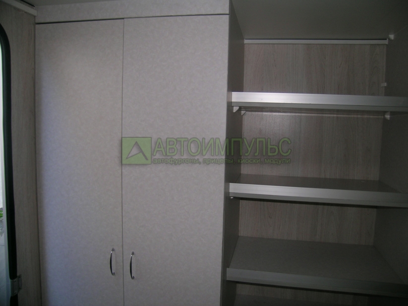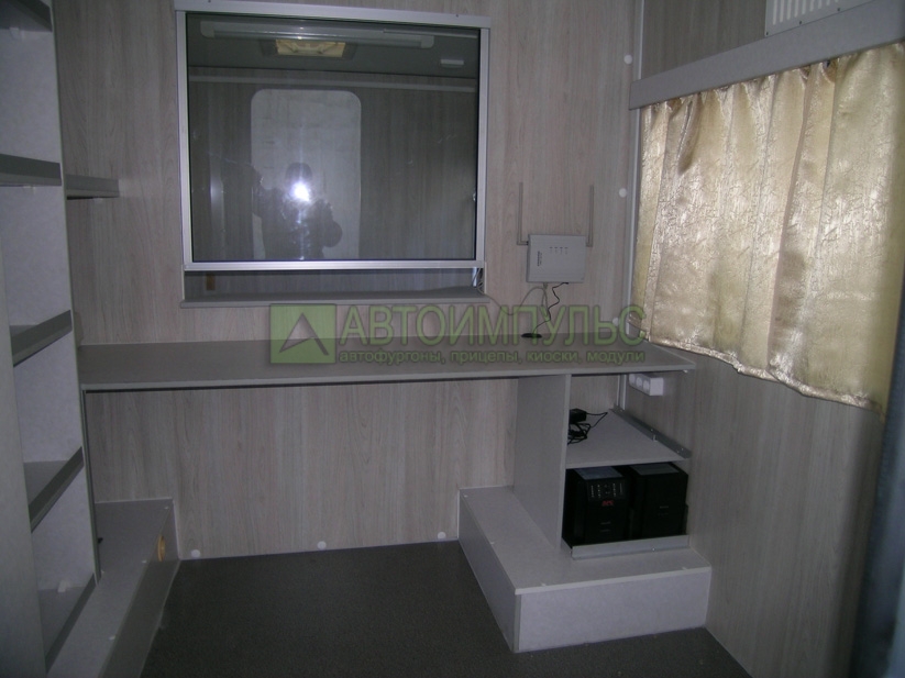мебель (рабочий стол, стулья, тумбочка, стеллажи для документов, полки для хоз. нужд), двуспальное место в задней части кузова трансформируется в места для сидения и стол; гардеробный шкаф; антресоли