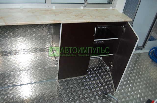 из бакелизированной панели, шкафы с полками, откидной лежак для отдыха персонала